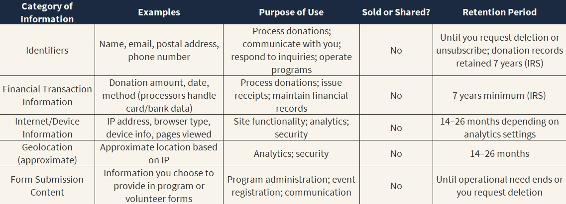 This Notice at Collection explains the categories of personal information HISW collects, the purposes for which we use it, and how long we retain it. This notice applies to visitors who access our website or provide information through online forms, donations, email, or other interactions.